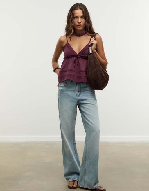 Stradivarius - Top à bretelles fines et bordures dentelle - Violet