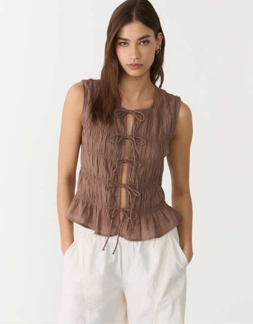 Stradivarius - Top effet froissé avec liens à nouer - Marron