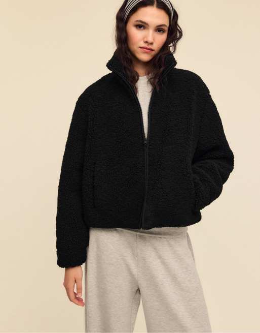 Stradivarius - Veste doublée à fermeture éclair en imitation peau de mouton - Noir