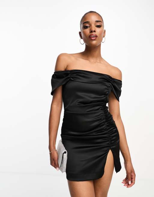 Style Cheat - Robe courte froncée à épaules dénudées en satin - Noir