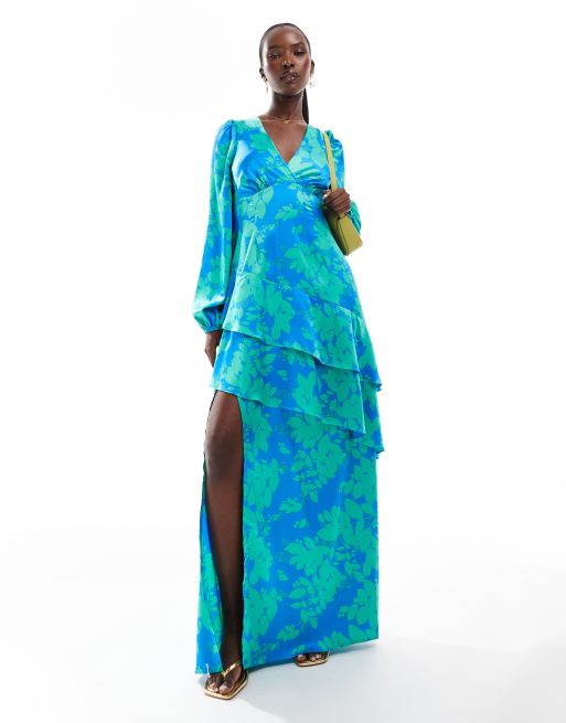 Style Cheat - Robe longue à décolleté plongeant et volants - Bleu fleuri