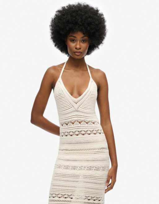 Superdry - Robe mi-longue en maille au crochet à franges - Blanc cassé désert