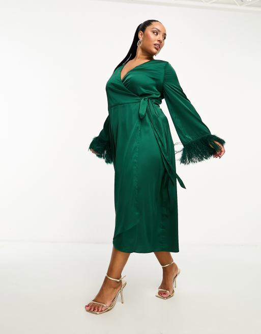 TFNC Plus - Robe portefeuille mi-longue satinée avec poignets en plumes synthétiques - Vert émeraude