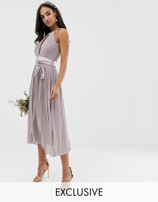 TFNC - Robe mi-longue plissée de demoiselle d'honneur croisée dans le dos et nouée - Gris