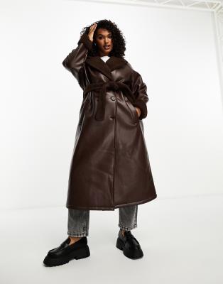 Threadbare Plus - Lois - Manteau aviateur long avec bordures en imitation peau de mouton - Marron chocolat