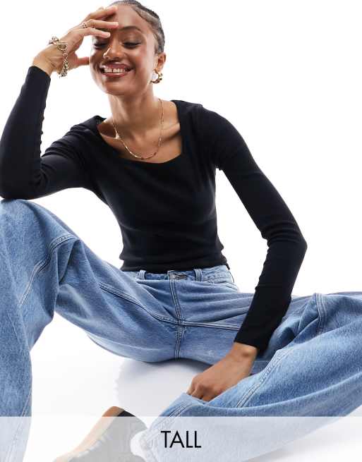 Threadbare Tall - Body côtelé à manches longues et encolure carrée - Noir