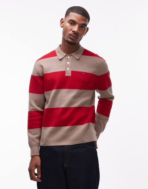 Tommy Hilfiger - Polo style rugby à rayures color block et manches longues - Rouge et fauve
