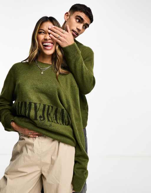 Tommy Jeans - Pull unisexe décontracté avec logo NY ton sur ton - Vert olive