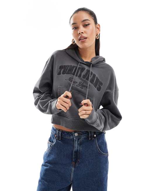 Tommy Jeans - Sweat à capuche court à logo - Gris délavé