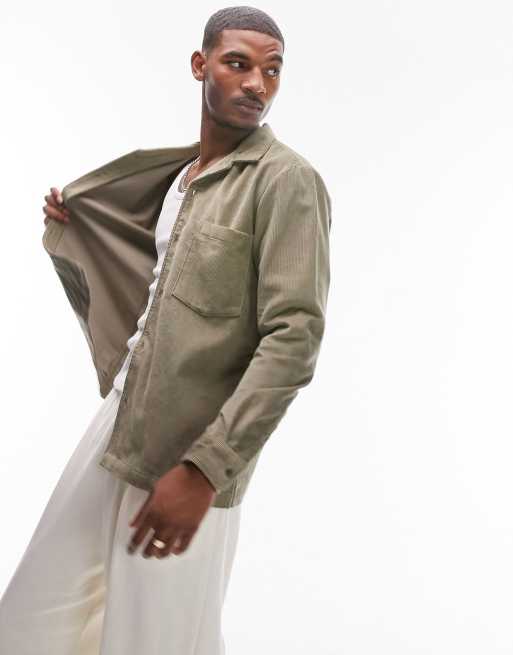 Topman - Chemise classique en velours côtelé à manches longues et col à revers - Kaki