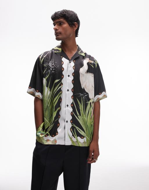 Topman - Chemise en satin à manches courtes avec imprimé héron - Noir