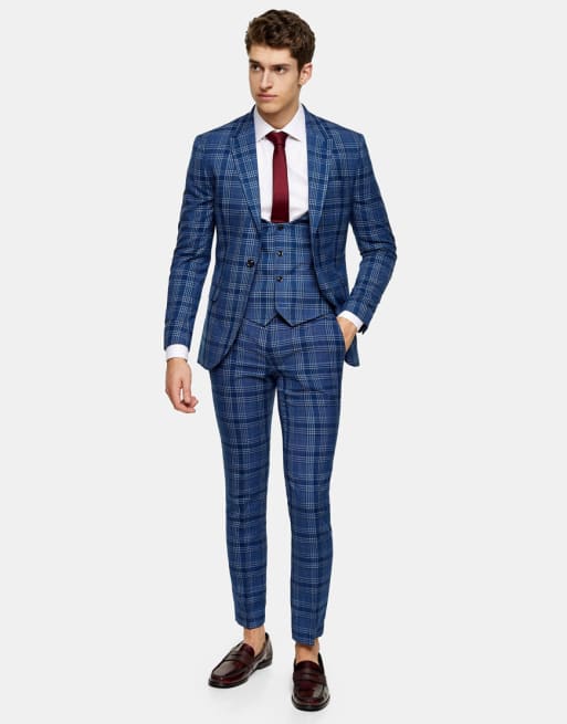 Topman - Costume ajusté à carreaux avec revers en pointe - Bleu