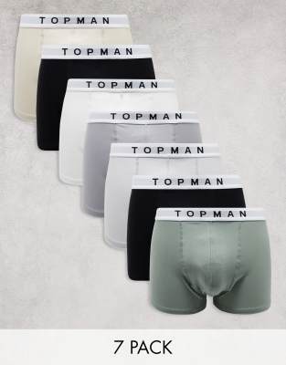 Topman - Lot de 7 boxers - Noir, blanc, gris, gris clair, taupe et vert avec taille blanche