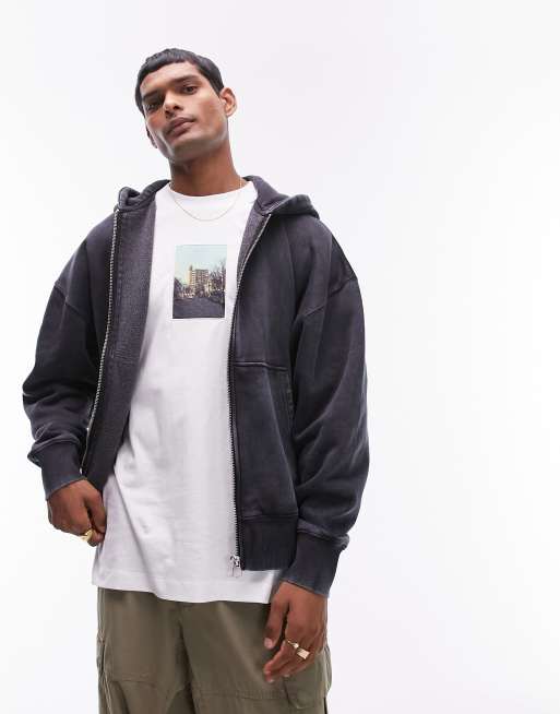 Topman - Sweat à capuche oversize épais de qualité supérieure à fermeture éclair - Noir délavé