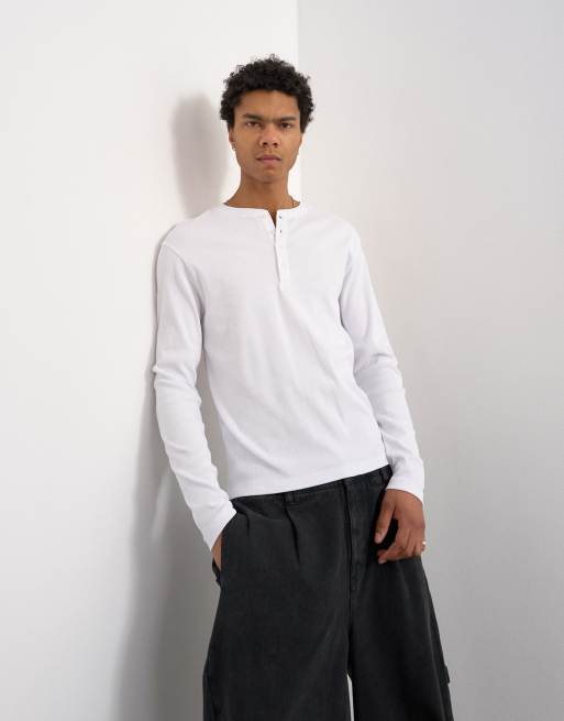 Topman - T-shirt côtelé coupe classique à manches longues et col tunisien - Blanc