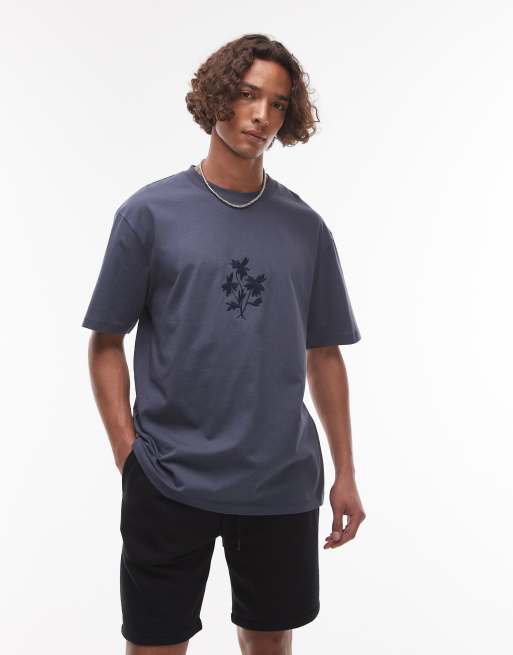 Topman - T-shirt décontracté de qualité supérieure avec fleurs brodées - Bleu