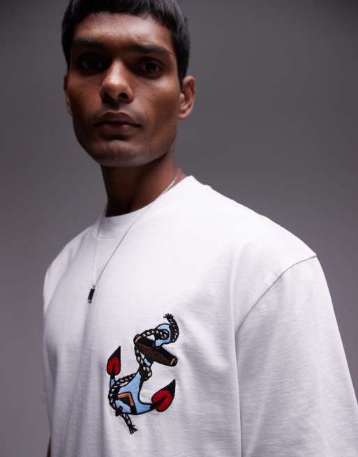Topman - T-shirt oversize de qualité supérieure avec ancre brodée - Blanc