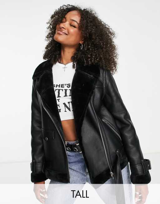 Topshop Tall - Blouson aviateur style motard en similicuir et imitation peau de mouton - Noir