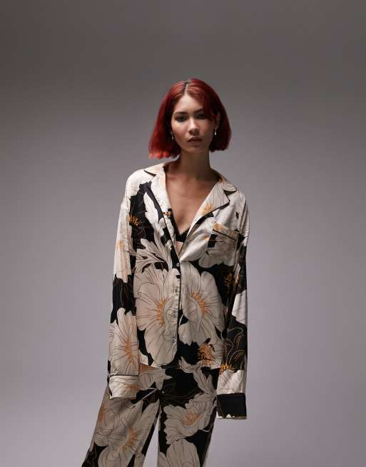 Topshop Tall - Ensemble de pyjama satiné à fleurs avec pantalon, chemise à liserés et masque de sommeil - Noir