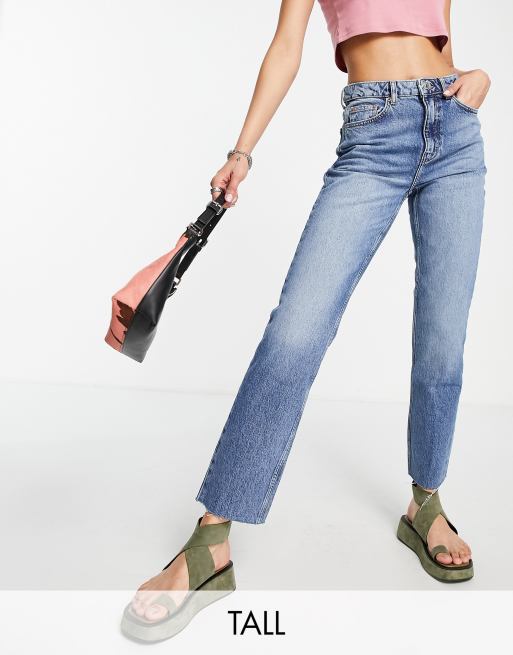 Topshop Tall - Jean droit raccourci à taille mi-haute et ourlets effilochés - Bleu moyen