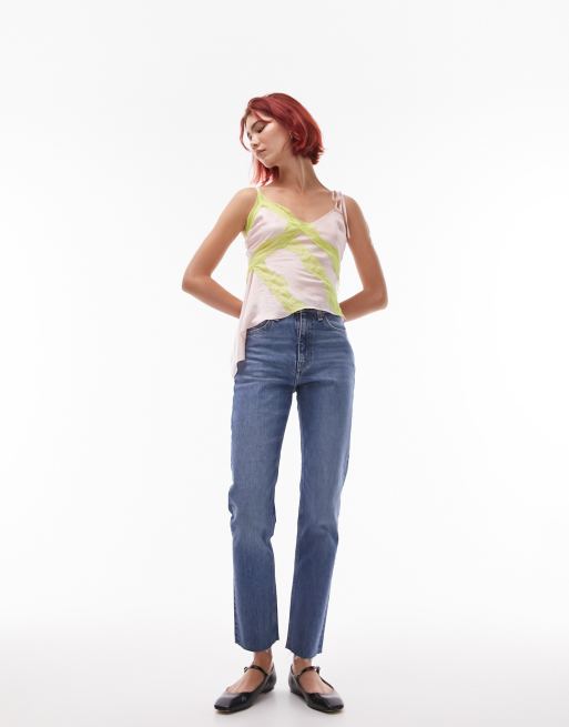 Topshop Tall - Jean droit raccourci à taille mi-haute et ourlets effilochés - Bleu moyen