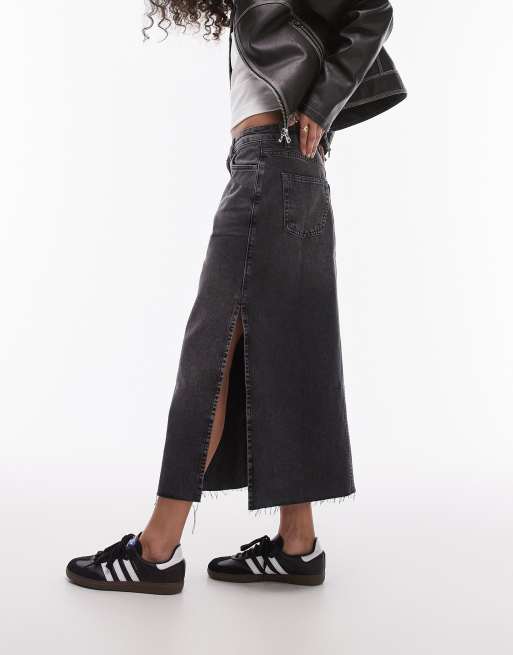 ASOS DESIGN - Jupe mi-longue en jean fendue sur le côté - Noir délavé