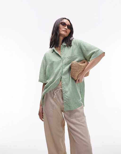 Topshop - Chemise manches longues en tissu flammé à rayures - Vert et beige