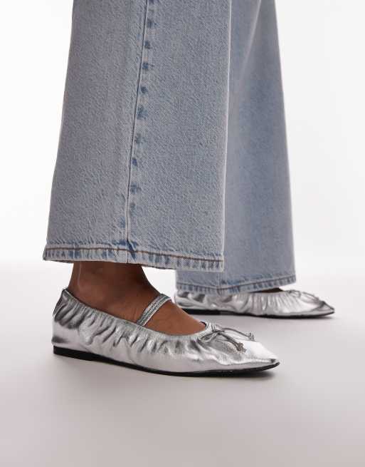 Topshop - Chia - Ballerines froncées en cuir avec lanière - Argenté