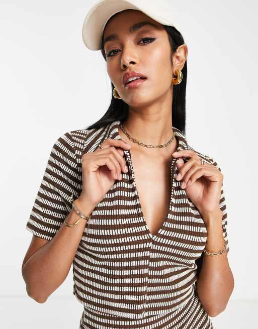 Topshop - Crop top d'ensemble côtelé rayé à col en V - Marron
