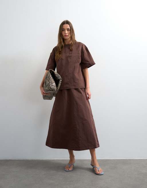 Topshop - Ensemble avec jupe longue évasée à taille élastique et t-shirt structuré - Chocolat