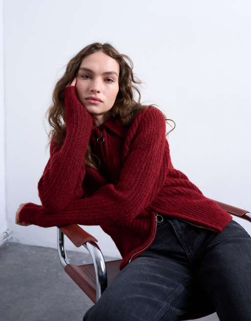 Topshop - Gilet en maille à col et fermeture éclair - Rouge