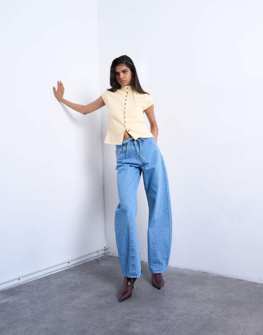 Topshop - Jean ample à taille haute avec ceinture nouée - Bleu délavé