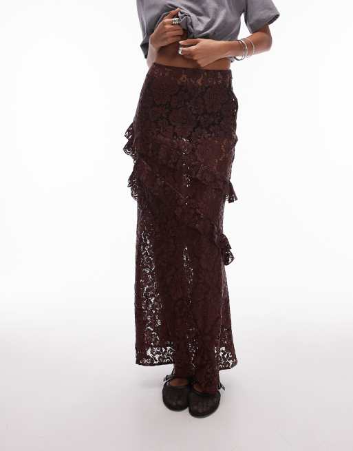 Topshop - Jupe longue à volants en dentelle transparente - Bordeaux
