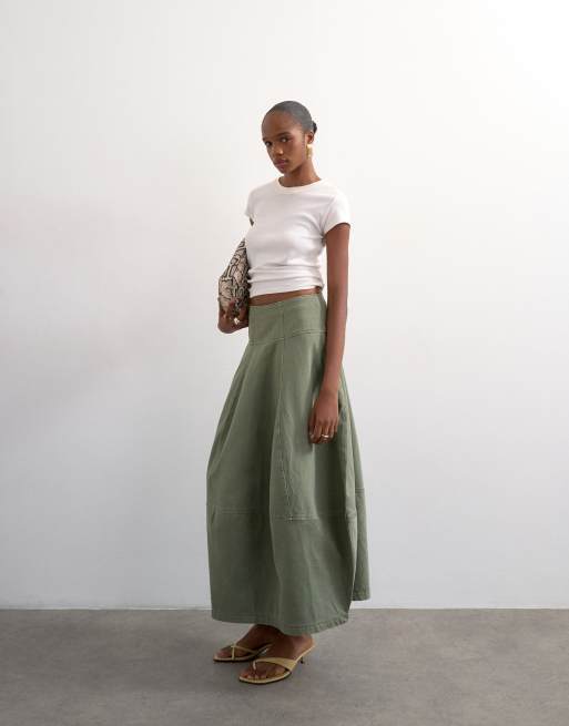 Topshop - Jupe longue et bouffante en denim avec surpiqûres - Kaki