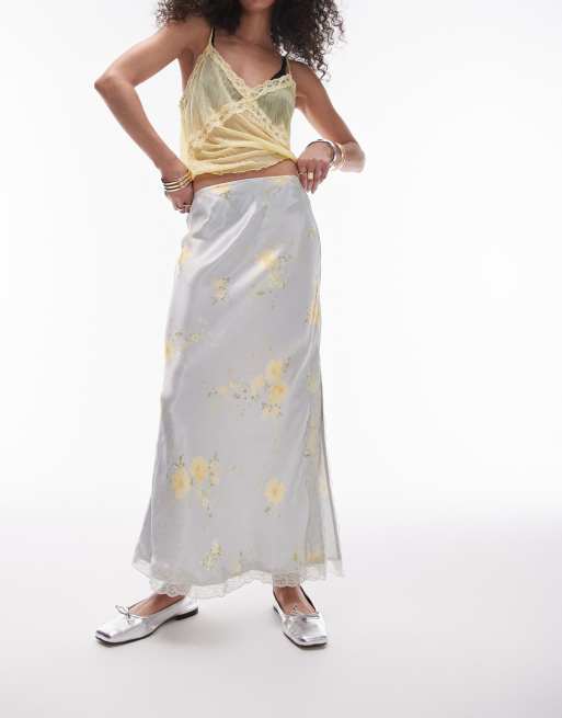 Topshop - Jupe mi-longue satinée à bordures en dentelle - Gris avec motif roses jaunes