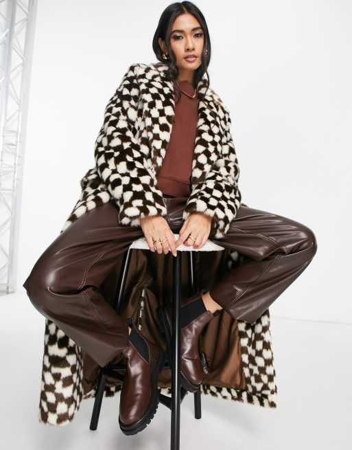 Topshop - Manteau long en fausse fourrure avec imprimé à damier