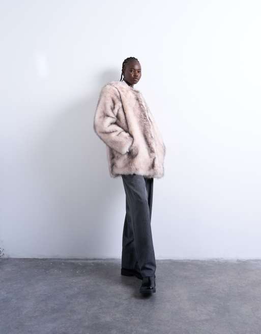 Topshop - Manteau mi-long sans col en fausse fourrure à rayures - Blanc