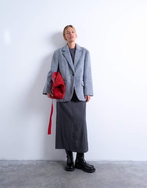 Topshop - Manteau style blazer long en laine mélangée brossée à un bouton - Gris chiné