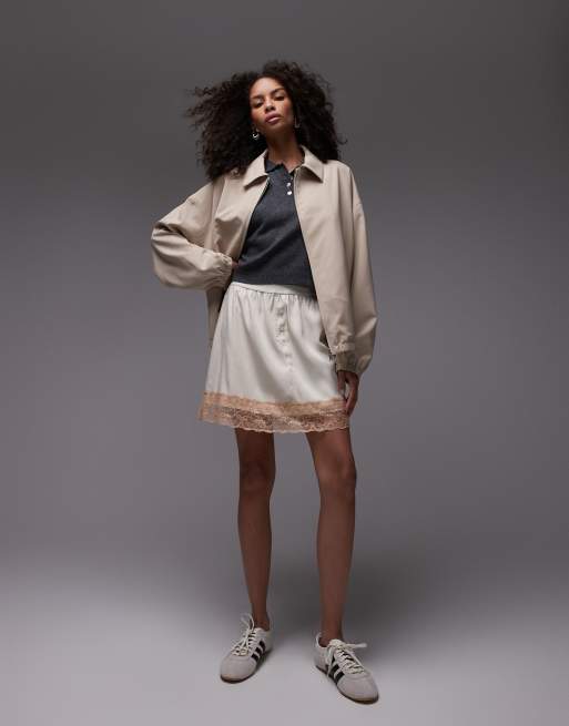 Topshop - Mini-jupe style jupon en satin avec bordure contrastante en dentelle - Huître