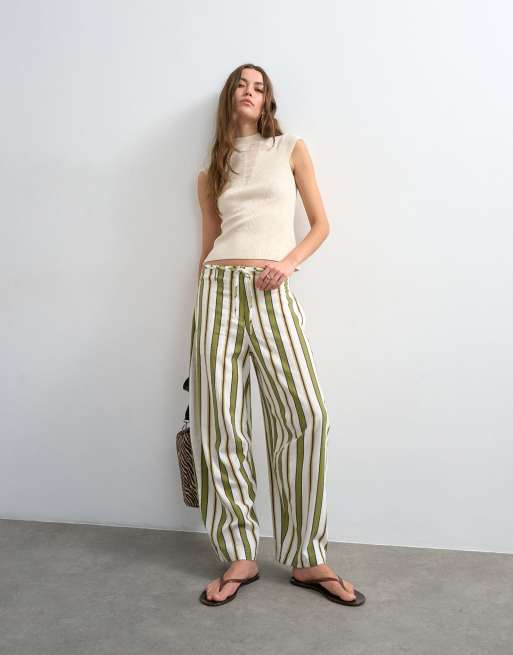 Topshop - Pantalon bouffant épuré noué à la taille avec lin - Vert rayé