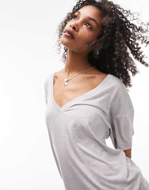Topshop - Premium - T-shirt basique ample à col en V - Gris chiné