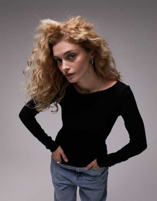 Topshop - Premium - Top côtelé à manches longues avec encolure bateau et fronces - Noir