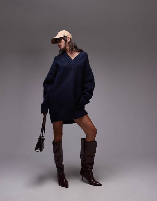 Topshop - Robe courte et oversize en maille avec col V montant - Bleu marine