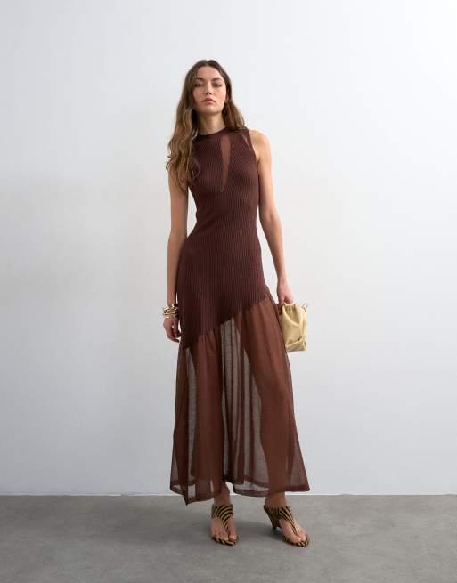 Topshop - Robe en maille et tissu transparent - Chocolat