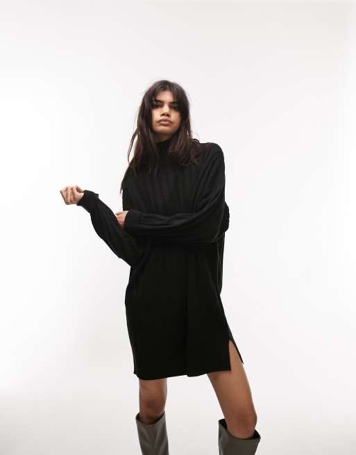 Topshop - Robe en maille nervurée à col cheminée - Noir