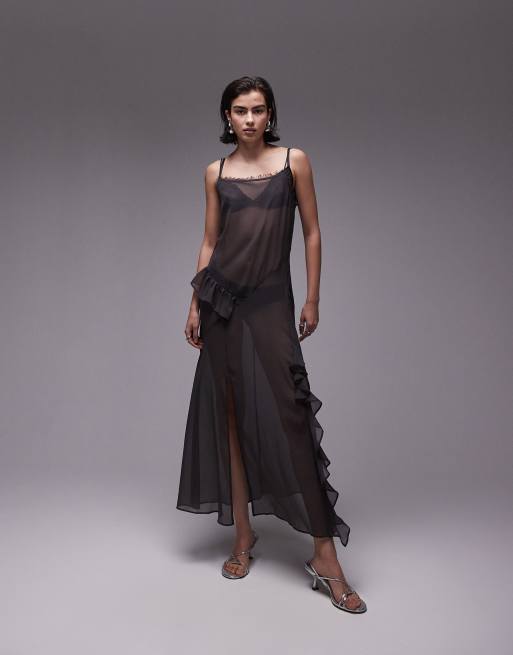 Topshop - Robe longue et transparente à volants - Gris anthracite