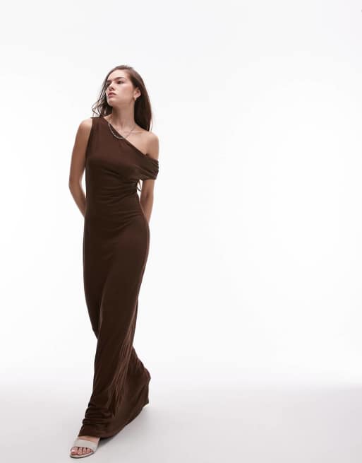 Topshop - Robe longue près du corps en jersey à épaules dénudées - Marron chocolat