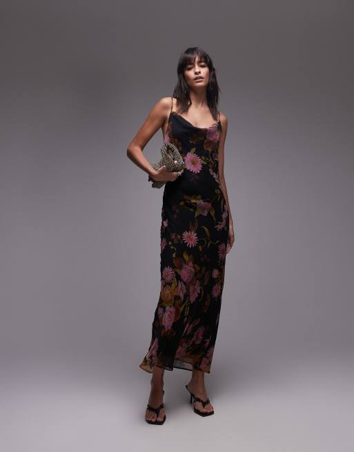 Topshop - Robe nuisette mi-longue à imprimé fleuri avec col bénitier et détail torsadé au dos - Rose/citron vert