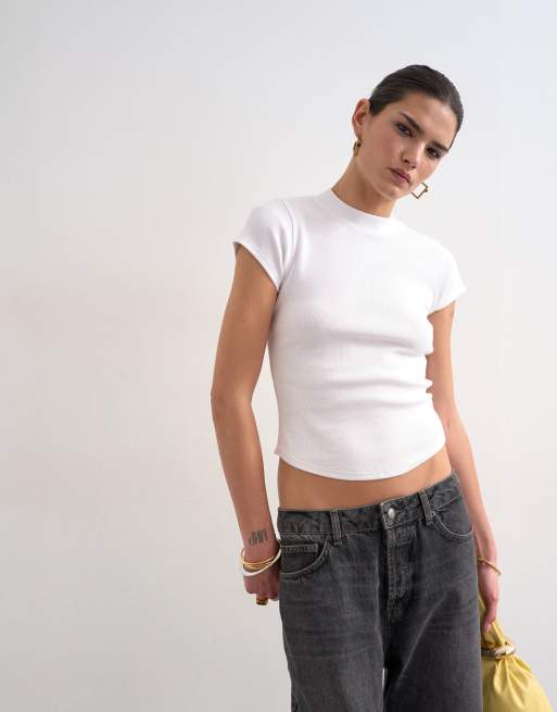 Topshop - T-shirt côtelé ajusté avec ourlet arrondi - Blanc