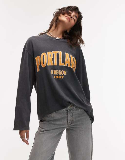 Topshop - T-shirt coupe skateur à manches longues avec motif Portland - Gris